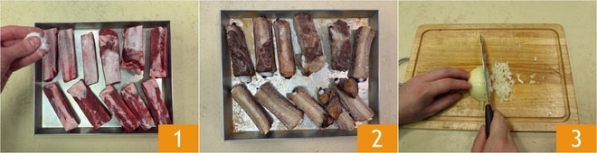 Pour préparer les travers de porc au vin blanc et fenouil sauvage, disposez les travers sur une plaque et salez-les 1, puis mettez-les dans le four ventilé à 250°C pendant 20 minutes, jusqu'à ce qu'ils soient bien dorés 2. En attendant, épluchez et hachez finement l'oignon 3.