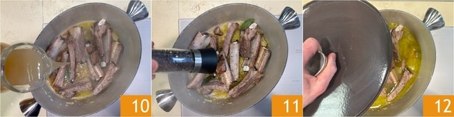 Couvrez avec le bouillon chaud, poivrez selon votre goût et portez à ébullition, puis baissez le feu, mettez le couvercle 12 et laissez cuire doucement pendant environ 2 heures, jusqu'à ce que les travers soient tendres. Remuez de temps en temps en ajoutant au besoin plus de bouillon ou d'eau.