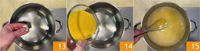 Pendant que les travers cuisent, préparez la polenta: portez l'eau salée à ébullition dans une casserole 13, puis versez la farine de maïs pour polenta instantanée et faites cuire le temps indiqué sur l'emballage, en remuant continuellement avec le fouet 15.