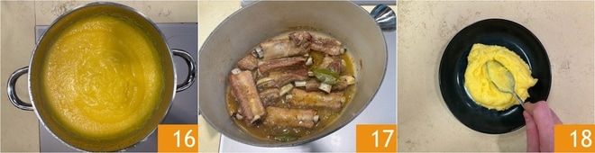 Gardez la polenta prête au chaud 16. Une fois les travers cuits, goûtez et ajustez le sel et le poivre. Dressez en répartissant une couche de polenta au fond 18.