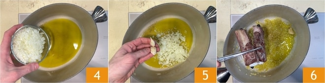 Dans une grande casserole, chauffez un peu d'huile, puis ajoutez l'oignon haché 4 et l'ail 5. Faites revenir à feu moyen jusqu'à ce que l'oignon devienne transparent. À ce stade, transférez les travers de porc dans la casserole 6.