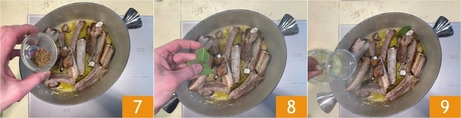 Salez, puis aromatisez avec les graines de fenouil 7 et les feuilles de laurier 8. Déglacez avec le vin blanc et laissez l'alcool s'évaporer 9.