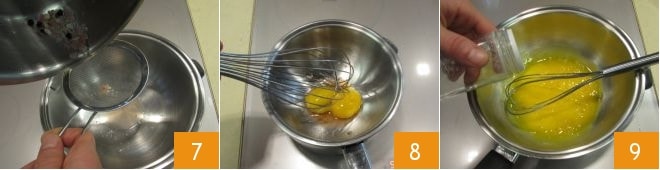 Filtrez le liquide bouilli en le transférant dans une casserole au bain-marie (ou préparez un bain-marie classique, si vous ne possédez pas une casserole avec bain-marie intégré) 7; assurez-vous que l'eau dans le récipient inférieur ne touche jamais le bol. Ajoutez également les jaunes dans la même casserole 8 et, munis d'un fouet, battez constamment le mélange à feu modéré. Salez 9 et continuez à battre les œufs jusqu'à ce qu'ils épaississent.