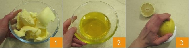 Pour préparer les œufs bénédictine, commencez par la sauce hollandaise, prenez le beurre clarifié 1, faites-le fondre dans une petite casserole ou au micro-ondes et réservez-le 2, puis pressez le demi-citron pour en extraire le jus 3.