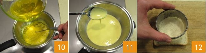 À ce stade, versez le beurre clarifié en filet, en veillant à continuer de battre constamment 10, jusqu'à ce que tout le beurre soit incorporé et que la sauce soit "montée" (cette opération prendra environ 6 minutes). À ce point, retirez la casserole du feu et ajoutez le jus de citron. Mettez la sauce de côté 11, en la gardant au chaud ou en la transférant dans un bol (à température ambiante, pas au réfrigérateur). Découpez des disques dans les tranches de pain avec un emporte-pièce de 6 cm de diamètre 12.