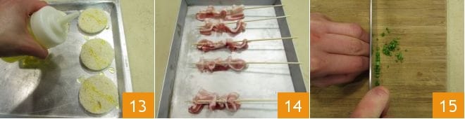 transférez-les sur une plaque et huilez-les légèrement en surface 13. Faites griller le pain dans un four statique à 180° pendant environ 4 minutes, jusqu'à ce qu'il soit doré. Enfilez les tranches de bacon sur des brochettes 14 et passez-les dans un four statique à 220° pendant 5 minutes, ainsi vous obtiendrez des tranches croustillantes et ondulées. Enfin, émincez finement la ciboulette 15 et mettez-la dans un petit bol.