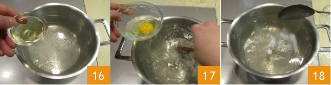 Enfin, consacrez-vous à la cuisson des œufs, afin de les servir chauds. Dans une casserole, versez l'eau et le vinaigre 16, mettez-la à chauffer et, entre-temps, cassez l'œuf dans un petit bol séparé, en faisant attention à ne pas endommager le jaune. Une fois que l'eau a atteint l'ébullition, mélangez avec une cuillère en bois pour créer un tourbillon, au centre duquel vous verserez l'œuf entier 17. Attendez que l'œuf émerge légèrement et, muni d'une cuillère, tournez délicatement le blanc autour de l'œuf lui-même 18.