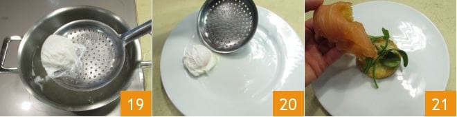 Avant de pouvoir retirer l'œuf de l'eau, attendez quelques minutes. Sortez-le avec l'écumoire 19, posez-le sur une assiette 20 et répétez la même opération pour les œufs restants. Maintenant, composez vos œufs bénédictine : pour la version au saumon : déposez sur une assiette un croûton de pain préalablement grillé à la base, placez des feuilles de mesclun, déposez une tranche de saumon 21