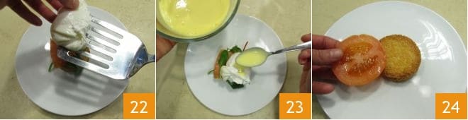 et ensuite l'œuf poché 22. Laissez couler la sauce hollandaise sur l'œuf 23 et ajoutez de la ciboulette, puis poivrez à votre goût. Maintenant, occupez-vous de la garniture au bacon : déposez sur une assiette un croûton, ajoutez une tranche de tomate 24,