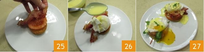 le bacon croustillant 25 et pour finir, terminez avec la sauce hollandaise 26 et aromatisez avec du poivre et de la ciboulette à votre goût. Servez immédiatement vos œufs bénédictine 27.