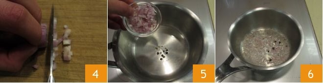 Avec un couteau à lame lisse, émincez finement l'échalote 4. Dans une petite casserole, versez le vinaigre, l'eau, le poivre en grains et l'échalote 5 et faites bouillir le mélange 6.